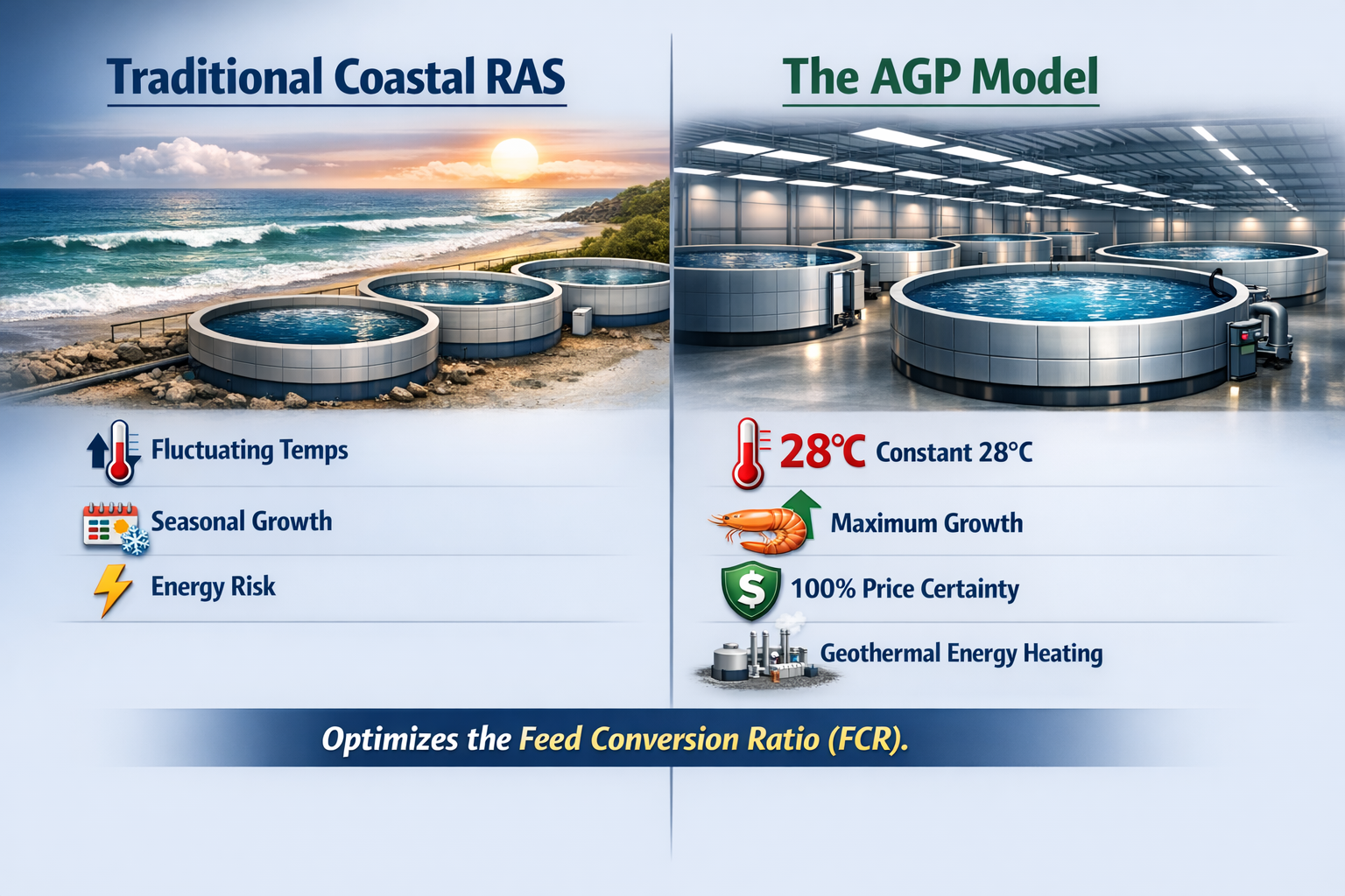 The AGP Solution: Our geothermal loop provides a "Thermal Shield." By keeping water at a constant 28°C (±0.5°C), we eliminate the energy drain of thermal stress